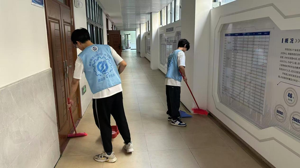 活动现场,身着统一蓝色志愿背心的同学们迅速进入状态,在明确的分组与分工下有序开展工作。办公区域内,大家细致梳理散落的文件与杂物,将各类物品归置整齐,让原本繁杂的空间重拾规整秩序;公共区域里,扫帚与簸箕的碰撞声交织成劳动乐章,同学们弯腰清扫地面浮尘,踮脚擦拭窗户污渍,对墙角、窗台等卫生死角进行 “地毯式” 清理,哪怕是缝隙中的碎屑也不放过。汗水浸湿了志愿服,却挡不住大家的干劲。活动尾声,同学们主动收集起沾着汗渍与灰尘的蓝色背心,统一送往清洗点清洗。经过共同努力,校园环境面貌焕然一新。