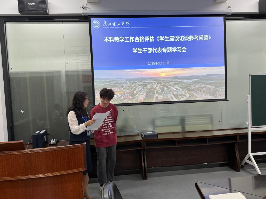 为检验学习成效,会议特别设置“模拟访谈”环节。由吕书记扮演评估专家,随机抽取学生干部进行现场“访谈”。“请问你了解学校的本科教学工作合格评估吗?”“如果专家问到课程设置的改进建议,你会如何回答?”面对模拟提问,班干部代表结合参与学科竞赛的经历,从课程设计、实习实训等方面进行了详实回答。随后的自由交流环节中,学生干部们踊跃讨论:“如何调动普通同学参与评估的积极性?”“座谈会中遇到不确定的问题该怎么应对?”吕书记与辅导员一一解答,并传授“倾听-思考-客观回应”的沟通技巧。