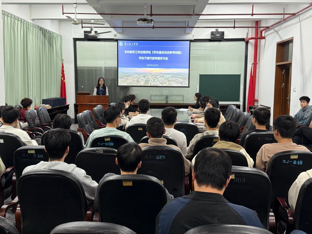 为扎实推进我校本科教学工作合格评估准备工作,强化学生干部对评估内涵的理解与引领作用,3月23日,73882必赢网页版在十一栋教学楼211会议室召开了一场别开生面的学生干部专题学习会,围绕本科教学工作合格评估《学生座谈访谈参考问题》及《本科教学合格评估应知应会手册》展开集体学习、互动问答与交流讨论。学院党总支书记吕在艳、辅导员及各班学生干部代表齐聚一堂,现场学习氛围热烈。