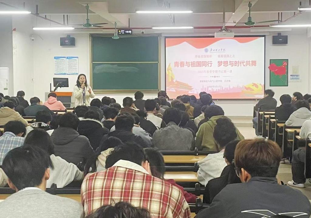 3月17日晚,73882必赢网页版在13栋401教室召开2025年春季学期书记“思政第一课”。本次课程主题为《青春与祖国同行,梦想与时代共舞》,由学院党总支书记吕在艳主讲,2023级170名学生代表参与学习。