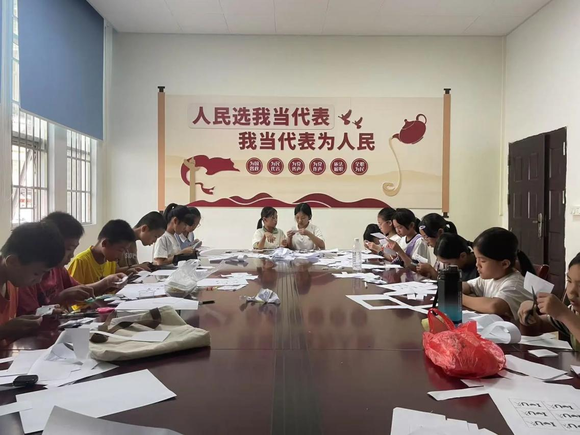 课堂上,《漆扇艺术教程课》成了孩子们的欢乐天地。队员们耐心示范调漆的比例、上色的技巧,手把手带着孩子们在素白扇面上勾勒线条、点缀图案。当孩子们举着自己画的漆扇欢呼雀跃时,传统文化的种子已悄悄在他们心里发芽——这不仅是一堂技艺课,更是一场文化传承的温暖对话。