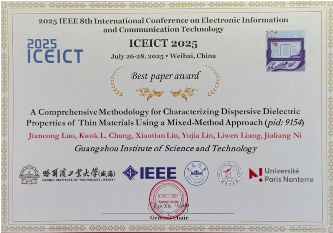 7月26日至28日,第八届国际电子信息与通信技术会议(2025 ICEICT)在山东威海隆重召开。本次会议由哈尔滨工业大学(威海)与国际电气电子工程师学会(IEEE)哈尔滨分会联合主办,并得到 IEEE 哈尔滨天线与传播/微波理论与技术 / 电磁兼容联合分会及安徽大学的大力支持。在我院钟国麟教授的悉心指导下,来自 24 电信 2 班的骆健聪、林雪怡、杨酉鹏,22造价2班的梁力文,以及22计科6班的倪嘉亮5名同学受邀参会。电子信息系与通信工程系的4位老师——黄明浩、王慧、郭晋成及阳柳老师也积极参与,他们的科研成果不仅成功投稿,还获得了收录发表的殊荣。