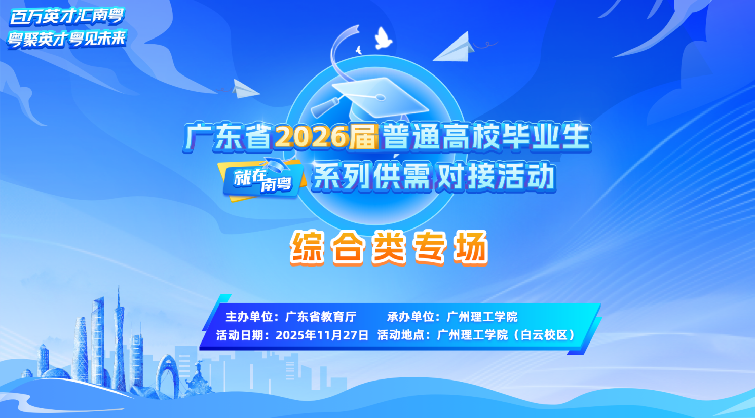 为深入贯彻党的二十大精神,全面落实党中央、国务院以及省委、省政府对高校毕业生就业工作的决策部署,扎实推进“百万英才汇南粤”行动计划,更好地服务国家经济社会高质量发展,促进高校毕业生(含研究生,以下简称“高校毕业生”)高质量充分就业,我校定于2025年11月27日(星期四)举办“就在南粤”广东省2026届普通高校毕业生系列供需对接活动(综合类专场),诚邀贵单位莅临选拔人才。有关事项函告如下: