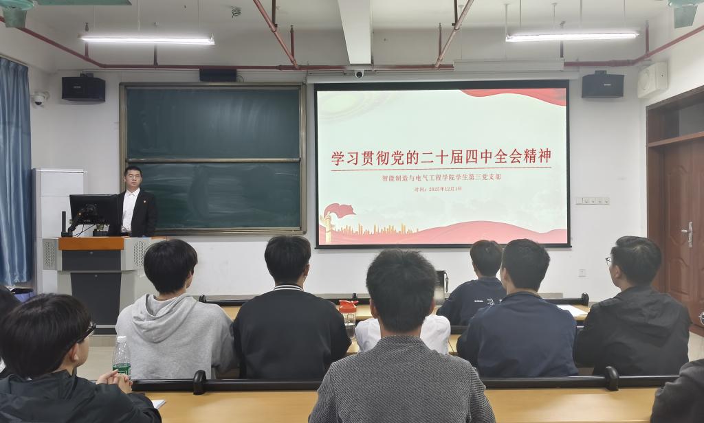12月1日,学院学生第一、第二、第三党支部分别在13栋教学楼402、403、404教室召开专题学习会,组织全体学生党员深入学习贯彻党的二十届四中全会精神,会议分别由何肇哲、杨智皓、刘梓涵主持。