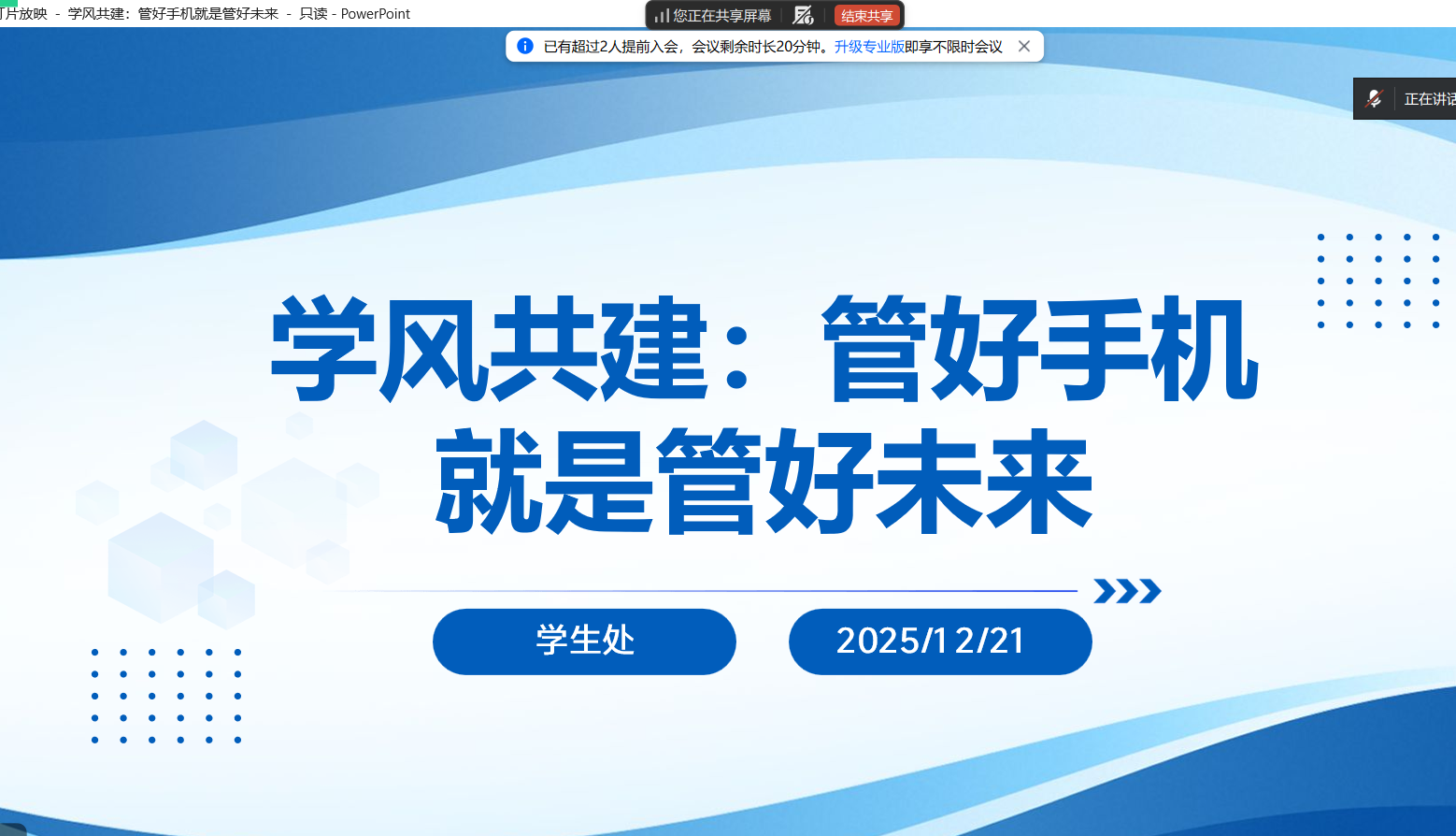 为引导学生合理使用手机,营造良好的学习氛围,12月21日晚,73882必赢网页版通过线上成功召开“学风共建:管好手机就是管好未来”主题班会,各班辅导员和班长担任主讲,全体学生积极参与。