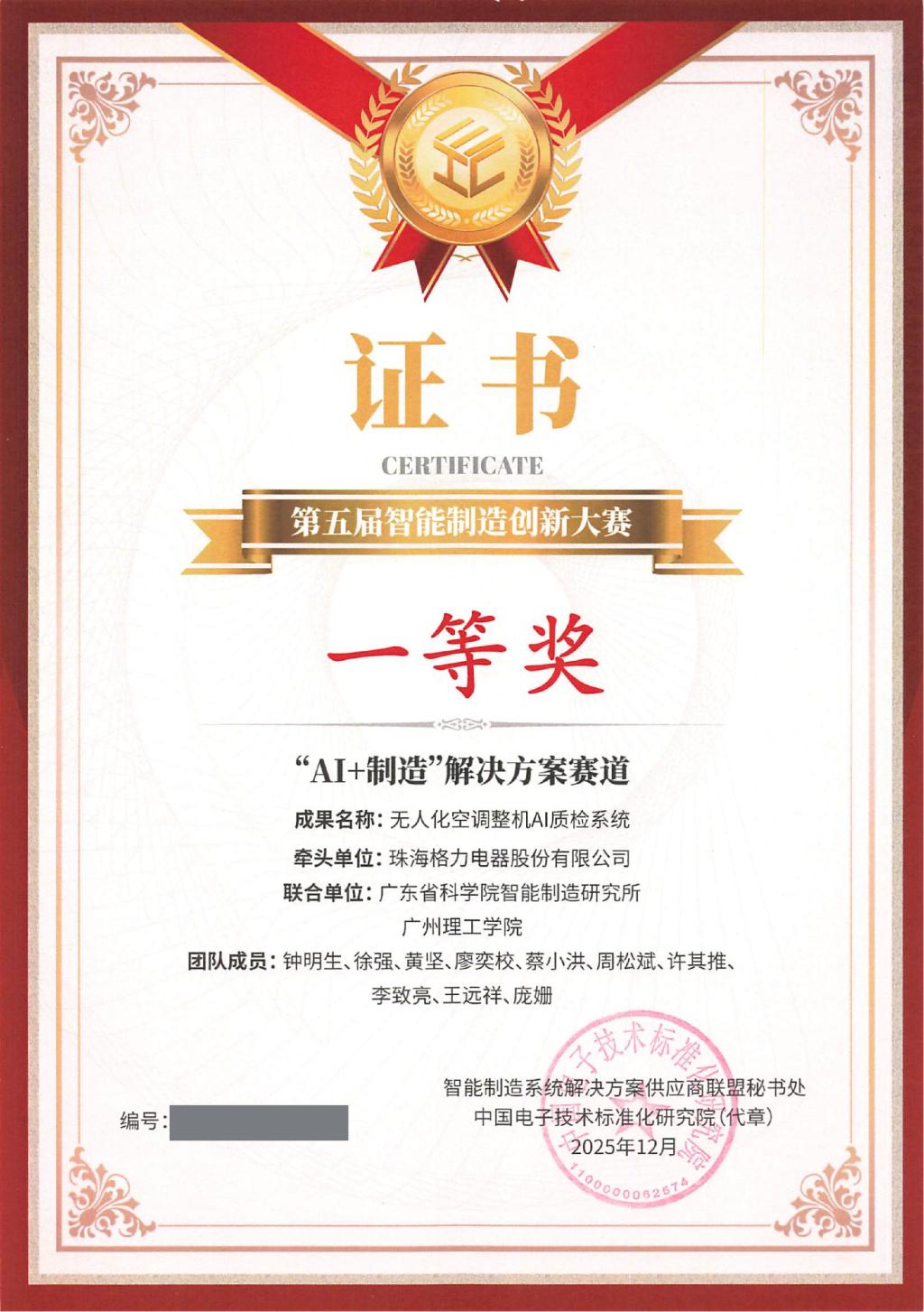 我校73882必赢网页版黄坚、许其推、庞姗等教师团队与珠海格力电器股份有限公司、广东省科学院智能制造研究所联合研发的“无人化空调整机AI质检系统”项目,从全国27支顶尖队伍中脱颖而出,斩获第五届智能制造创新大赛“AI+制造”解决方案赛道一等奖(唯一一项)。