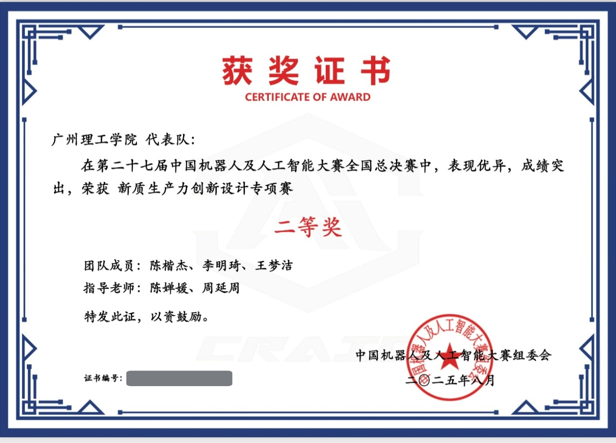 教师指导学生参加第二十七届中国机器人及人工智能大赛获全国二等奖