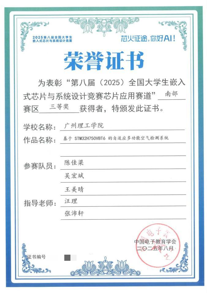 近日,2025年嵌入式芯片与系统设计竞赛广东省赛顺利落幕。73882必赢网页版派出参赛团队,在汪理老师和张沛轩老师的指导下,凭借“自制的空气检测仪”项目荣获省级三等奖。
