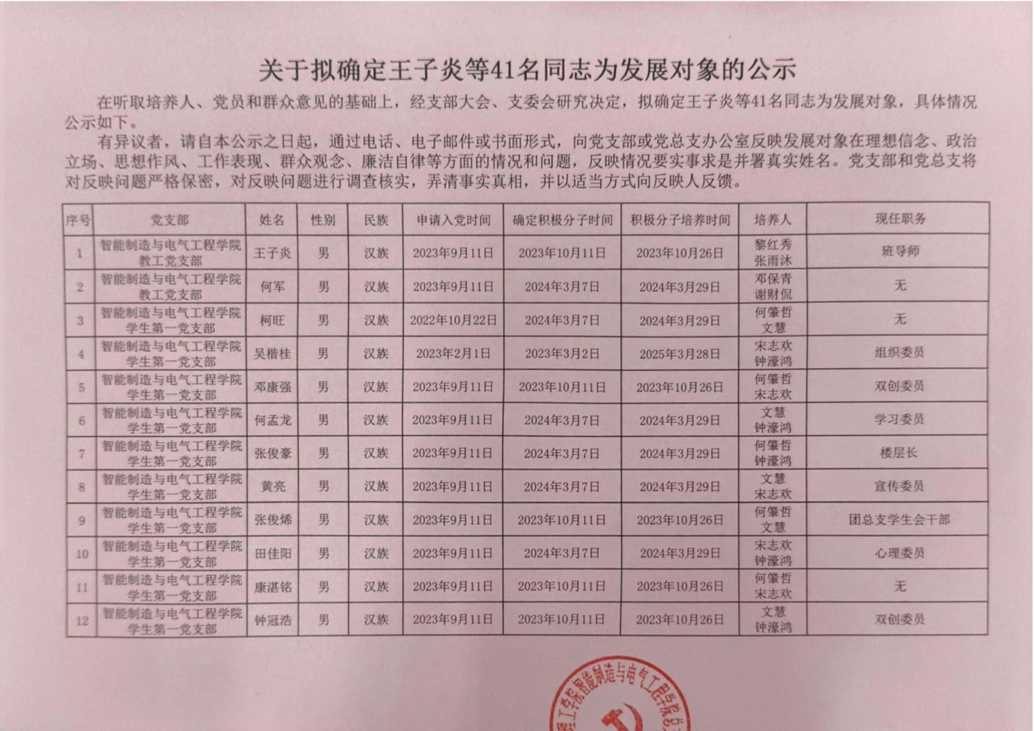 在听取培养联系人、党员和群众意见的基础上,经支部大会、支委会研究决定,拟确定王子炎等41名同志为发展对象,具体情况公示如下。