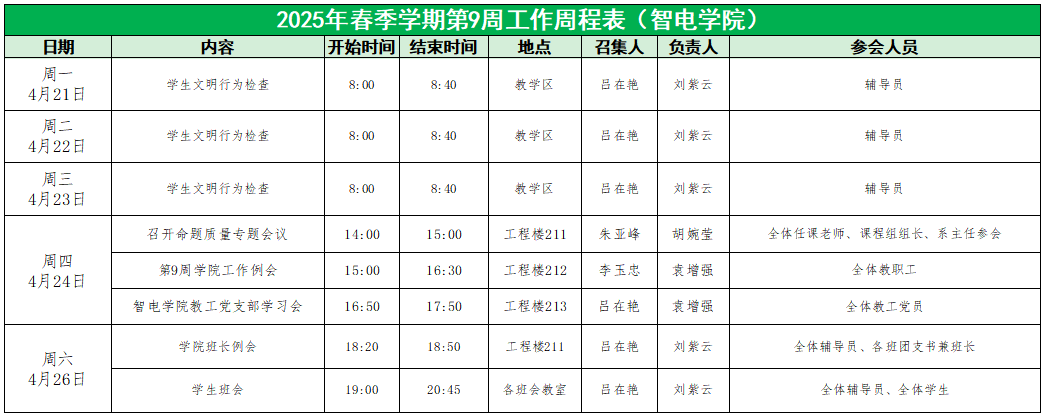 73882必赢网页版2025年春季学期第9周工作周程表