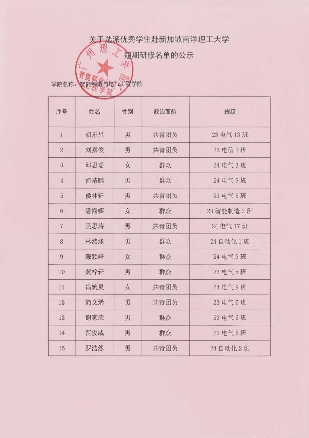 根据广州理工学院 《关于选派优秀学生赴新加坡南洋理工大学短期研修的通知》文件要求,我院通过宣传和组织申报,经学生本人提出申请、学院严格审核后推选出15名符合条件的学生,现将名单予以公示,具体如下: