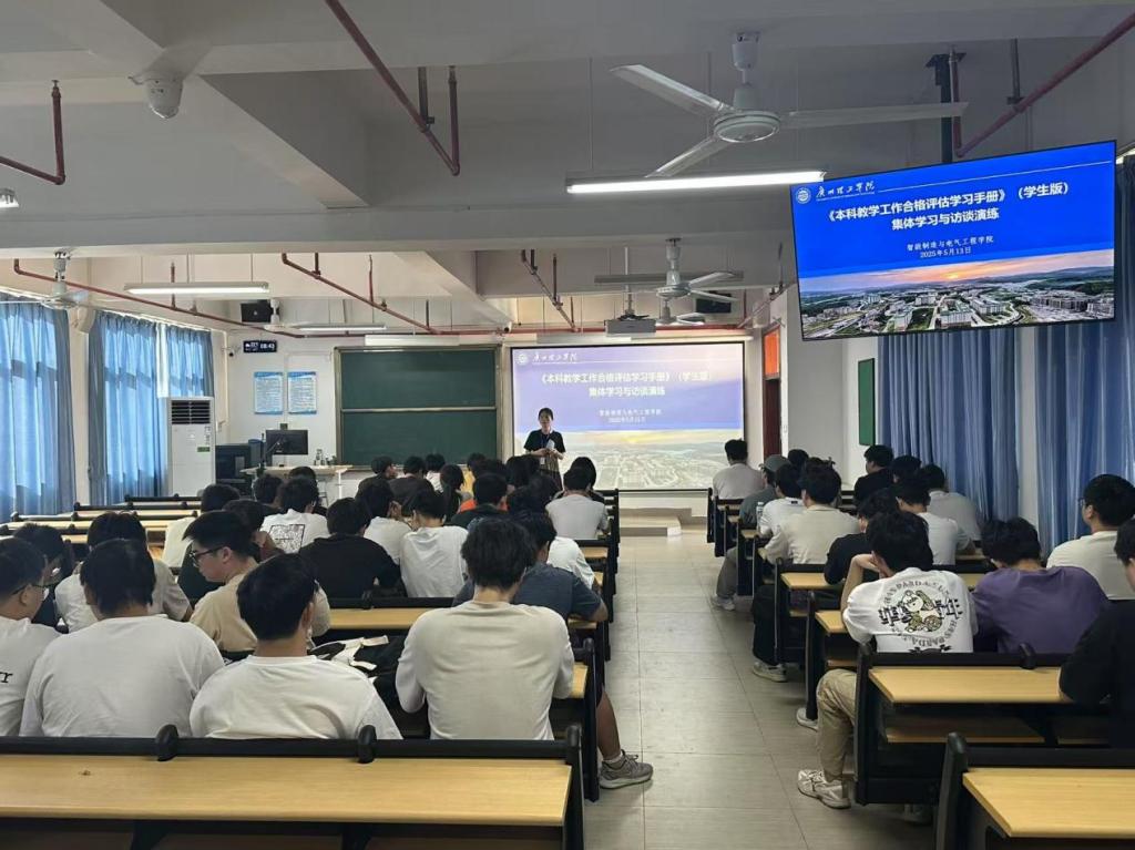 学习与访谈演练会分为知识学习和访谈模拟演练两部分。在知识学习阶段,辅导员围绕两大核心内容展开讲解。首先是学校基本概况,从学校的发展历程、办学理念到学科特色、师资力量等方面,进行了全面且细致地介绍,让学生们对学校有了更深入、更立体地认识。接着是合格评估基本知识,辅导员详细解读了本科教学工作合格评估的指导方针、评估流程以及重要意义,使学生们明白评估工作与自身学习、成长和学校发展的紧密联系。