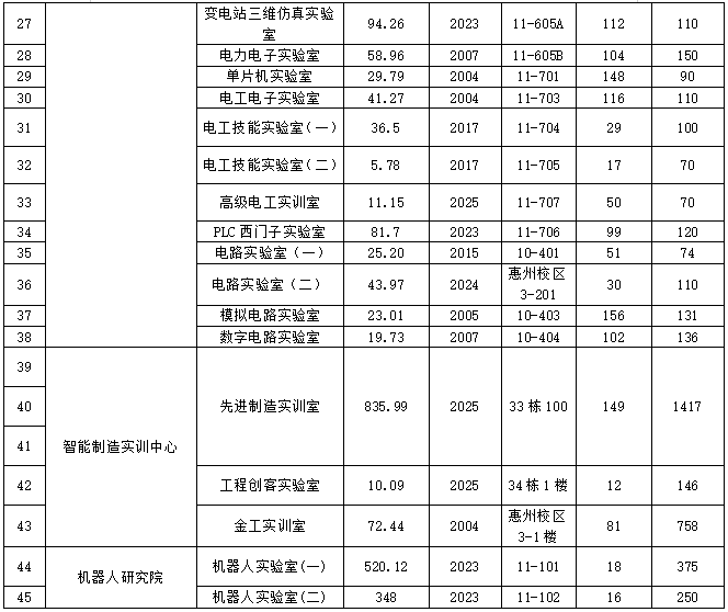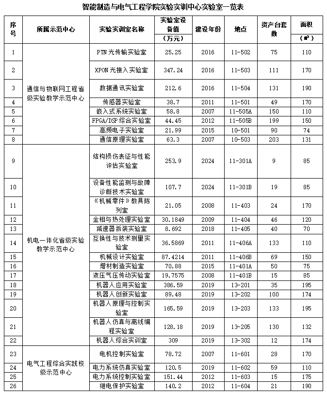 73882必赢网页版实验实训中心现有2个省级实验教学示范中心、1个校级综合实践示范中心、智能制造实训中心以及人工智能与机器人研究院实验室,共有实验室45间,实验室面积7700多㎡,教学科研仪器设备总值5000余万元,为智能制造工程、电气工程及其自动化、机械设计制造及其自动化、机器人工程、自动化、电子信息工程、通信工程7个本科专业的教学和科研提供有力支撑。全学年接纳实验26697人次,达5528实验学时。学院成立有实验实训中心,负责实验室的建设与日常管理。实验室的所属及分布见一览表。